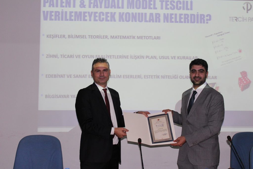 Tercih Patent Firması çalışanı Süleyman Hanlı “Fikri Haklar & Sınai Mülkiyet Hakları, Patent & Faydalı Model” konularında bilgi verdi. Buluşların ilk olarak ihtiyaçların karşılanması için yapıldığına dikkat çeken Hanlı, geçmişte buluş sahiplerinin buluşu koruma adına işaret ve simgeler koyduklarını söyledi. İlk patent kanunun 15. yüzyılda Venedik’te çıkarıldığına dikkat çeken Hanlı, “Fikri haklar; telif hakları ile sınai mülkiyet hakları olarak ikiye ayrılmaktadır. Telif hakları içerisinde bilim ve sanat, müzik, güzel sanatlar, sinema eserleri ve bilgisayar programları, sınai mülkiyet haklarında ise patent, marka ve tasarım yer almaktadır.” dedi.
